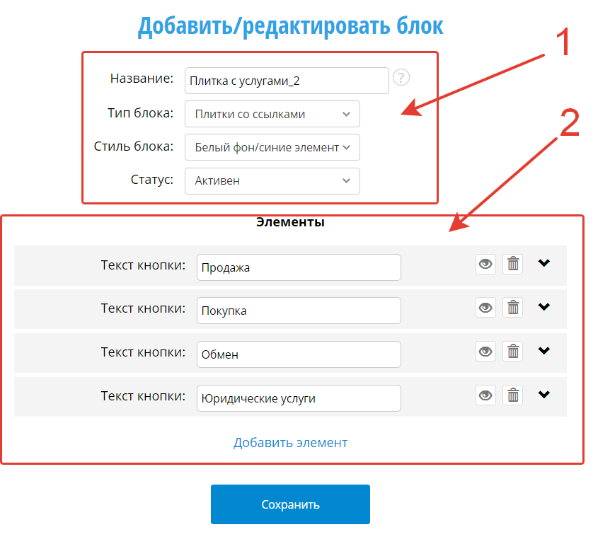 Структурно форма редактирования блока состоит из двух частей: