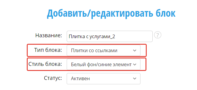 Тип блока - Определяет структуру контента блока. От выбора типа блока зависит набор полей блока и наличие повторяющихся элементов.