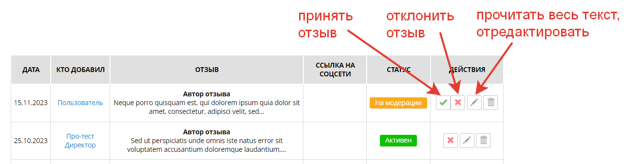 В модуле Сайт есть раздел "Отзывы". Сюда попадают отзывы оставленные клиентами на сайте, а также добавленные через админку.