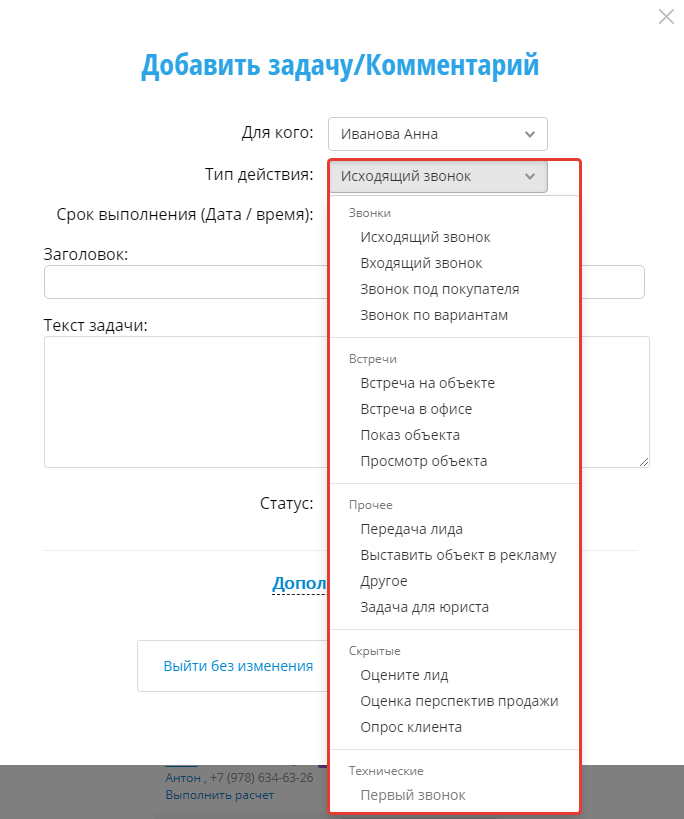 В CRM-системе существуют так называемые Особые задачи, требующие некоторых действий от человека, которому эта задача была поставлена. Чтобы поставить такую задачу, выберите ее в поле Тип действия на этапе постановки задачи.