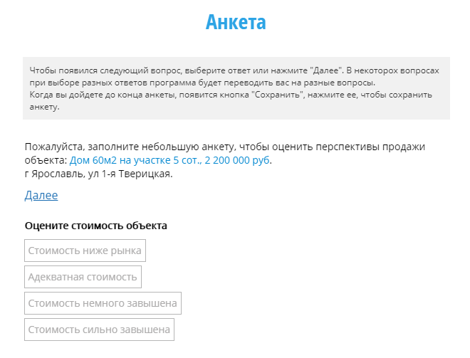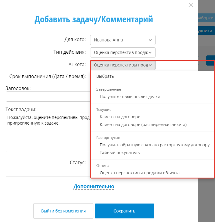 Оценка перспектив продажи объекта. После выбора типа задачи появится возможность выбрать подходящую анкету для заполнения.