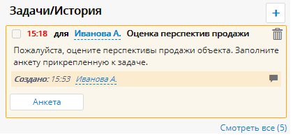 Выберите анкету «Оценка перспективы продажи объекта» и нажмите Сохранить. Пользователю придет задача следующего вида.