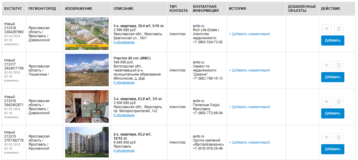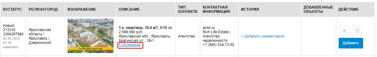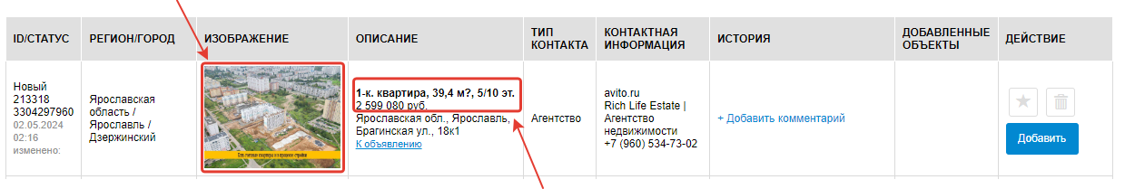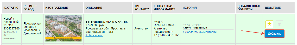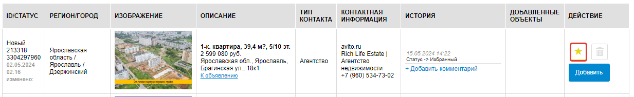 В столбце История, будут отображаться все дейсвия , которые были произведены по данному объекту, а также вы можете внести свои комментарии, напрмер, вы позвонили продавцу, получили каку-либо информацию, и ее можно добавить в комментарий для упрощения работы в дальнейшем с этим объектом. Данные комментарии будите видеть только вы.
