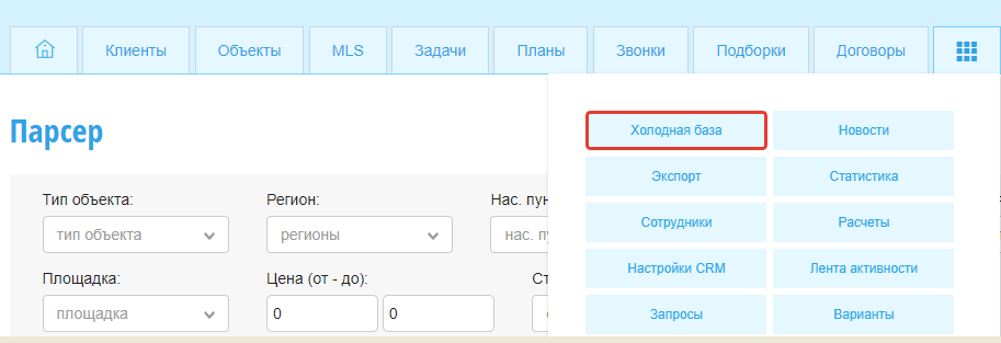 Для работы с Парсером зайдите во вкладку Холодная база в личном кабинете