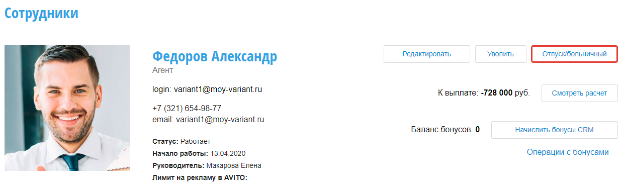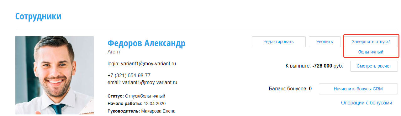 После выхода сотрудника из отпуска или больничного нажмите Завершить отпуск/больничный в этом же модуле.