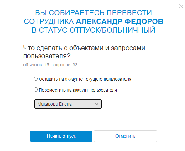 Выберите, что сделать с объектами и запросами пользователя: оставить на его аккаунте или перевести на другого сотрудника. Во втором случае потребуется выбрать агента, на которого временно перейдут объекты. Нажмите Начать отпуск.