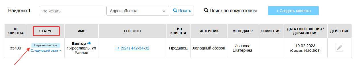2. Далее в столбце "Статус" вы сможете увидеть на какой стадии воронки сейчас находится Клиент.