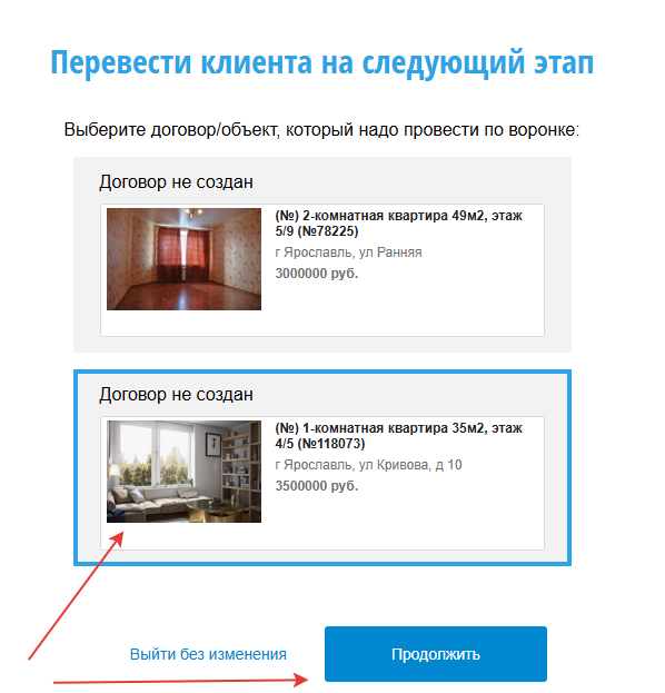 То при переводе по воронке в диалоге Следующий этап, добавится промежуточное действие: нужно выбрать тот объект, который надо перевести по воронке.