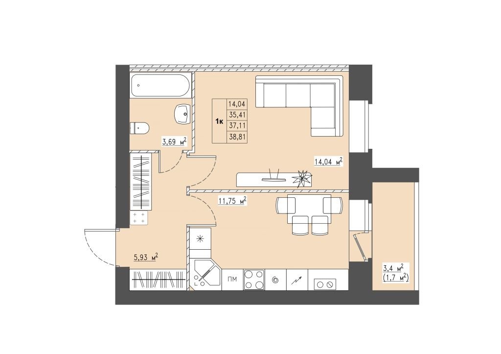 Площадь:  38.8/14.04/11.75