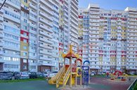 Большой двор с достаточным количеством парковочных мест и современной детской площадкой.