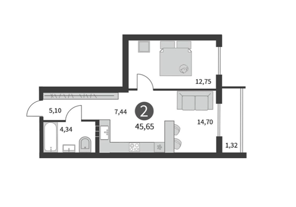 Общая площадь - 45,65 м2. м2. Отличный вариант для молодой семьи.