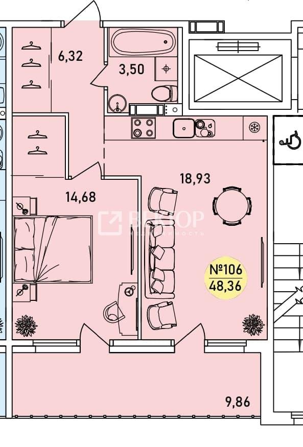 1-комнатная квартира 48.36м2, этаж 4/9