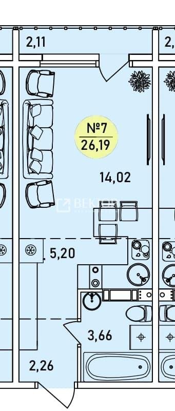 9+ комнатная квартира 26.19м2, этаж 1/9 №118472