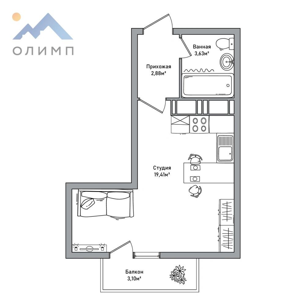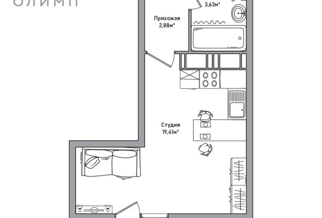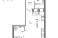 Просторная комната совмещённая с кухней с большими окнами, оснащенными естественным светом для заполнения пространства. Высота потолков около 2,75 метров. Есть возможность зонирования: выделение спальной зоны, а также создание уголка для отдыха или работы.