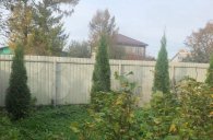 Забор из металлопрофиля, по периметру забора высажены насаждения.