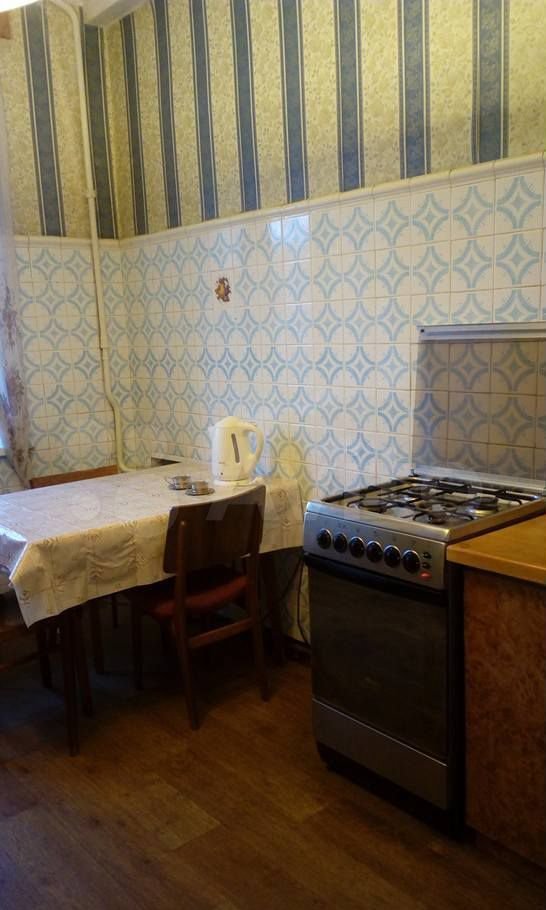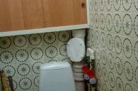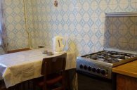 Кухня почти квадратная 10 кв. м, пол – линолеум. Под окном большой шкаф для хранения варений и овощей. Плита газовая. Потолок подвесной. Можно сделать кухню-гостиную.