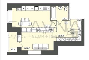 1-комнатная квартира 45.5м2, этаж 9/9