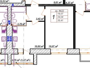 На 1-комнатную квартиру в кирпичном доме на 4м этаже площадью 34,6м.