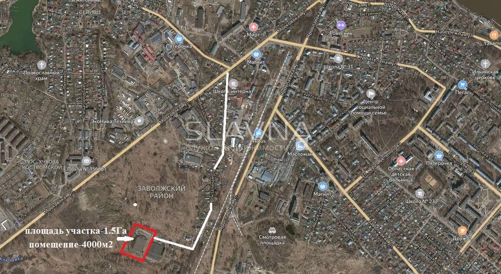Арт. 43492112 Сдается помещение 4000 м2 на участке в 1.5Га. До склада идет асфальтированная дорога. Отличное место для склада, так же подойдет для любого большого бизнесаавто/продукты/строй материалы и др..Перед складом большая асфальтированная площадка.Помещение находиться в центре Заволжского района г.Костромы.