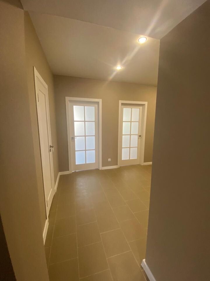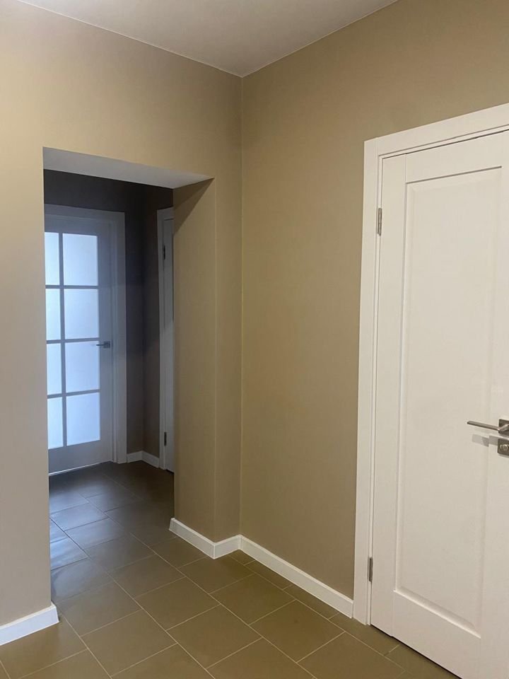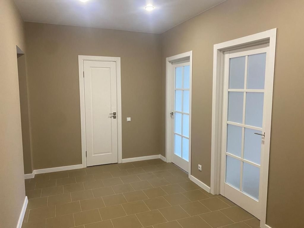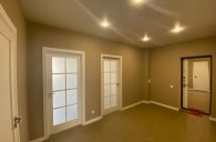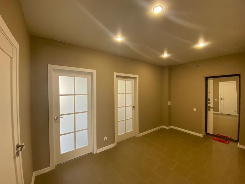хорошая входная дверь, хорошие межкомнатные двери, натяжные потолки со светодиодными светильниками.
